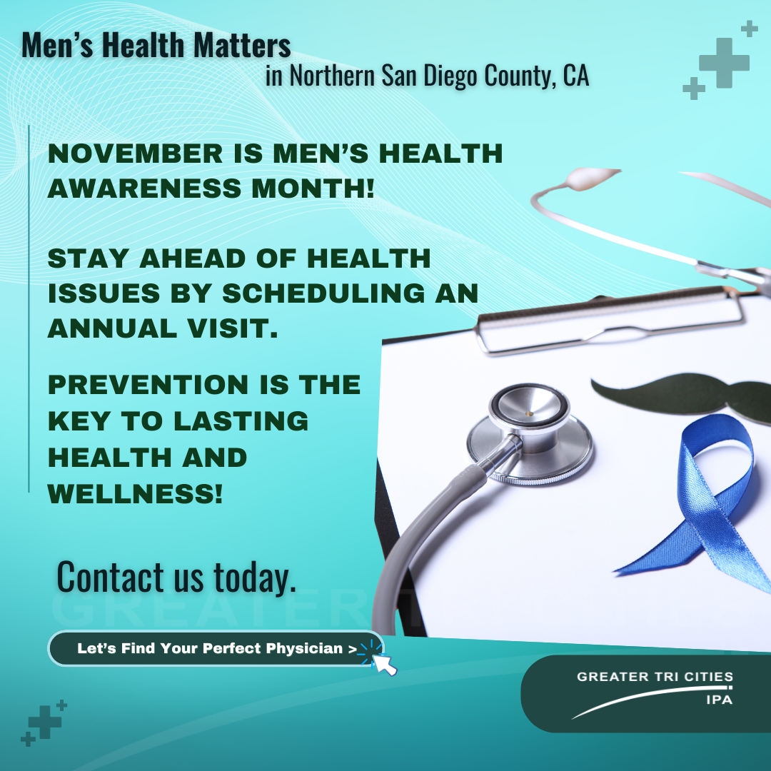 If you haven’t scheduled your annual health check-up, November—Men’s Health Awareness Month—is the perfect time. Take charge of your health by booking an appointment with a Greater Tri-Cities IPA physician today. Together, we’ll develop a personalized health plan to help you live a longer, healthier life.